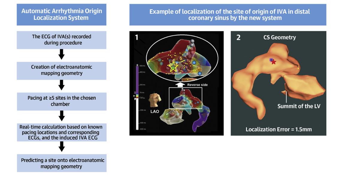 Prior site of origin systems to identify idiopathic ventricular arrhythmias (IVA) are limited by the need to create complete electroanatomic maps (EAM), inability to localize intracardiac structures/vessels and require pre-procedural cardiac imaging. Our Automatic Arrhythmia Origin Localization (AAOL) system addresses these issues. The AAOL system combines 3-lead, 120-ms QRS integrals with pace mapping to predict the site of earliest ventricular activation and project that site onto patient-specific EAM geometry. In a prospective, multicenter study of patients undergoing IVA catheter ablation, twenty-three IVA origin sites were localized by the AAOL system with a mean localization accuracy of 3.6 mm, better than any prior published system.