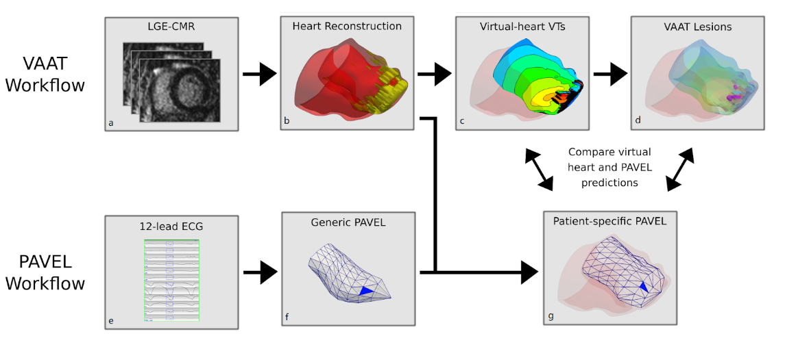 We recently developed two non-invasive methodologies to help guide VT ablation: population-derived automated VT exit localization (PAVEL) and virtual-heart arrhythmia ablation targeting (VAAT). We hypothesized that while very different in their nature, limitations, and type of ablation targets (substrate-based vs. clinical VT), the image-based VAAT and the ECG-based PAVEL technologies would be spatially concordant in their predictions. This project is to test this hypothesis in ischemic cardiomyopathy patients in a retrospective feasibility study.